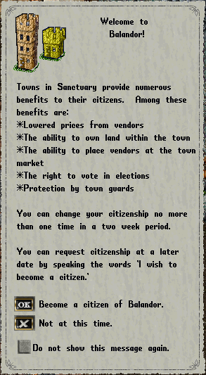 When you become a citizen, all characters tied to your account will become citizens of that town, so chose your city wisely.